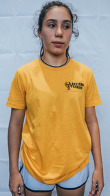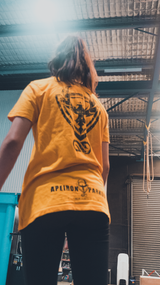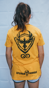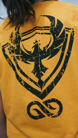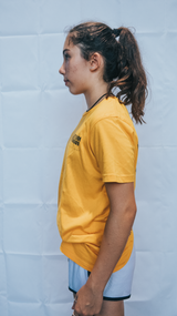 The Logo shirt is an extended length t-shirt in a yellow colourway that features the brand's full logo on the front and back along with the crest on the back.